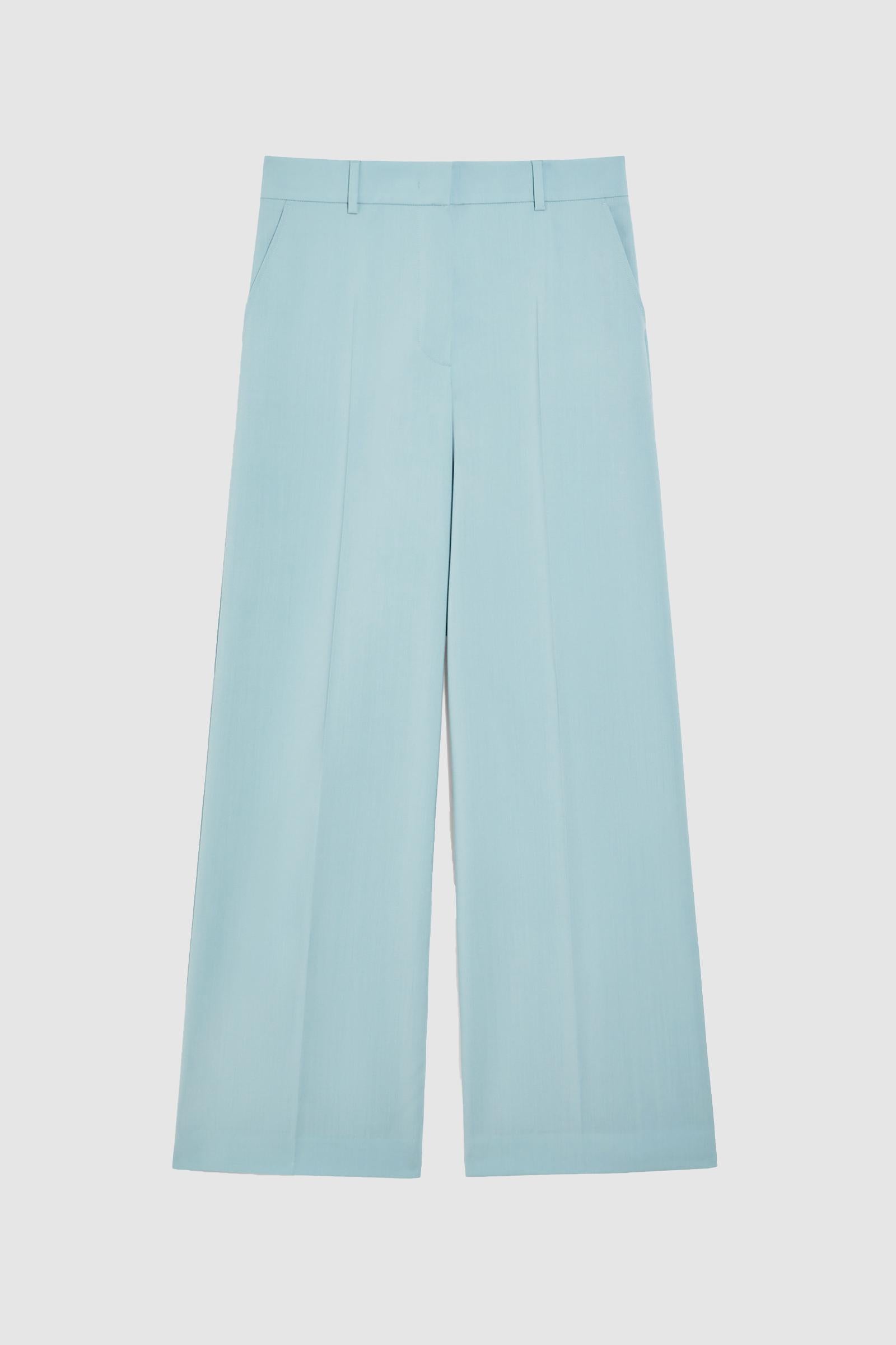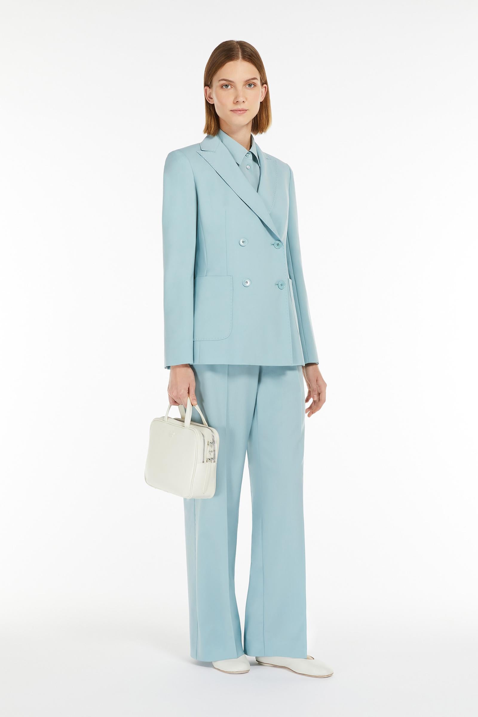 Pantalone a palazzo realizzato in tela di pura lana stretch. Modello dalla linea morbida con gamba dritta e piega stirata, tasche alla francese sui fianchi e tasche a filetto con bottone sul retro. Rifinito con passanti per cintura, si chiude con alto listino in vita, patta con zip e gancetto.Composizione:100% lana vergine.