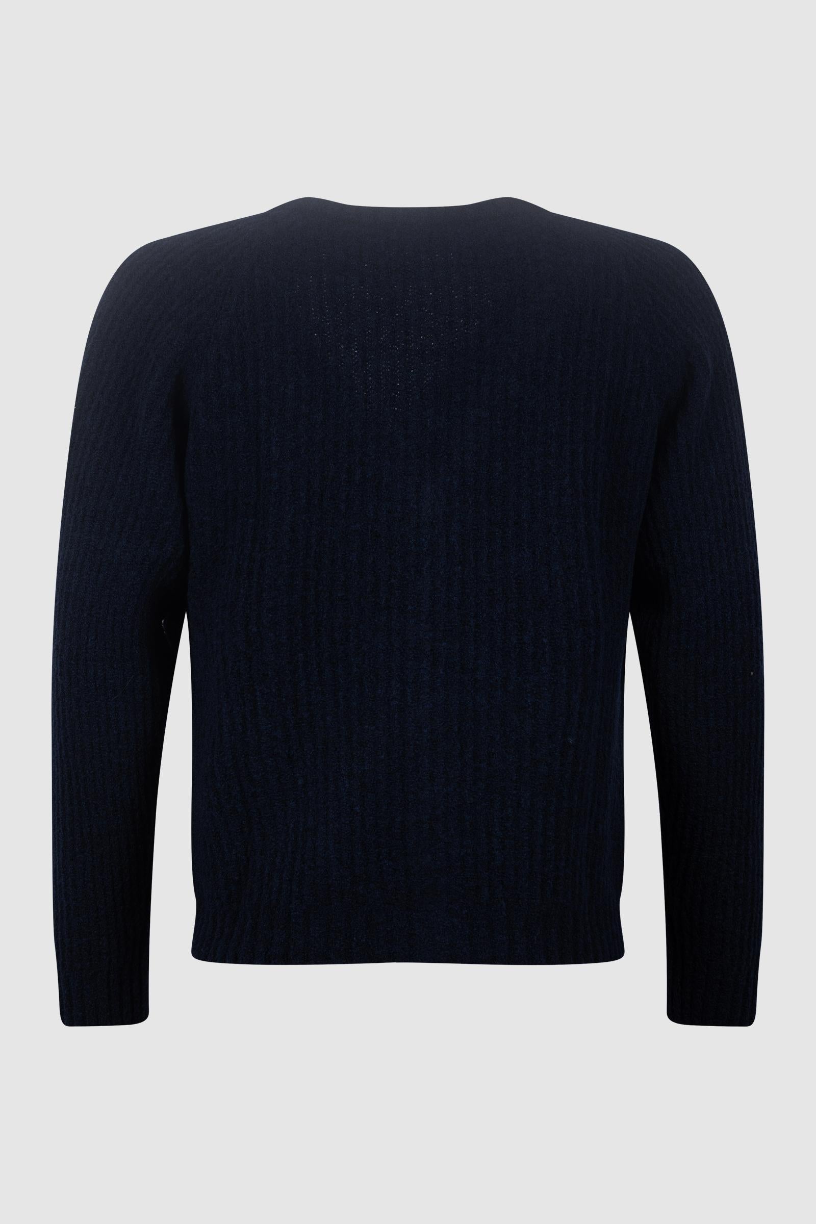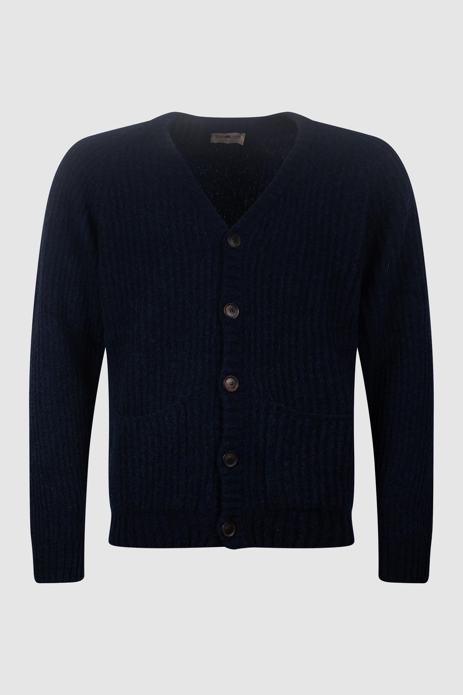 Il design classico con collo a V e chiusura con bottoni frontali è arricchito da una lavorazione a coste verticali che dona profondità e struttura al tessuto.